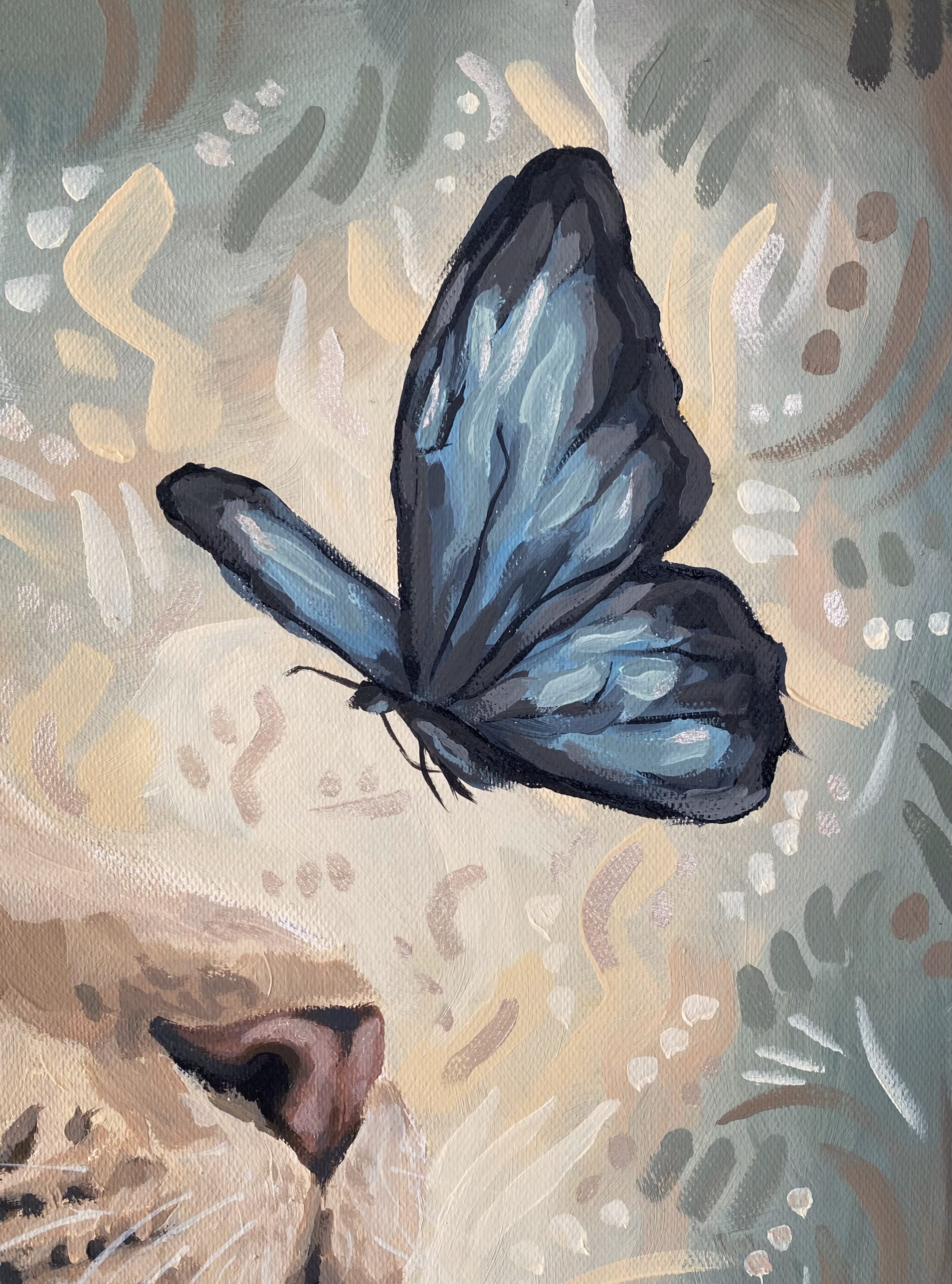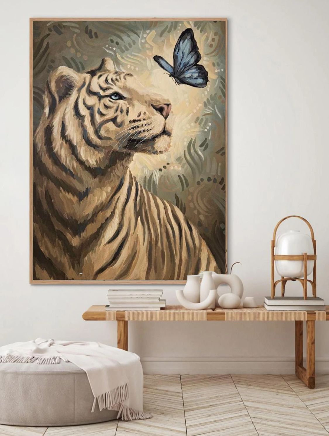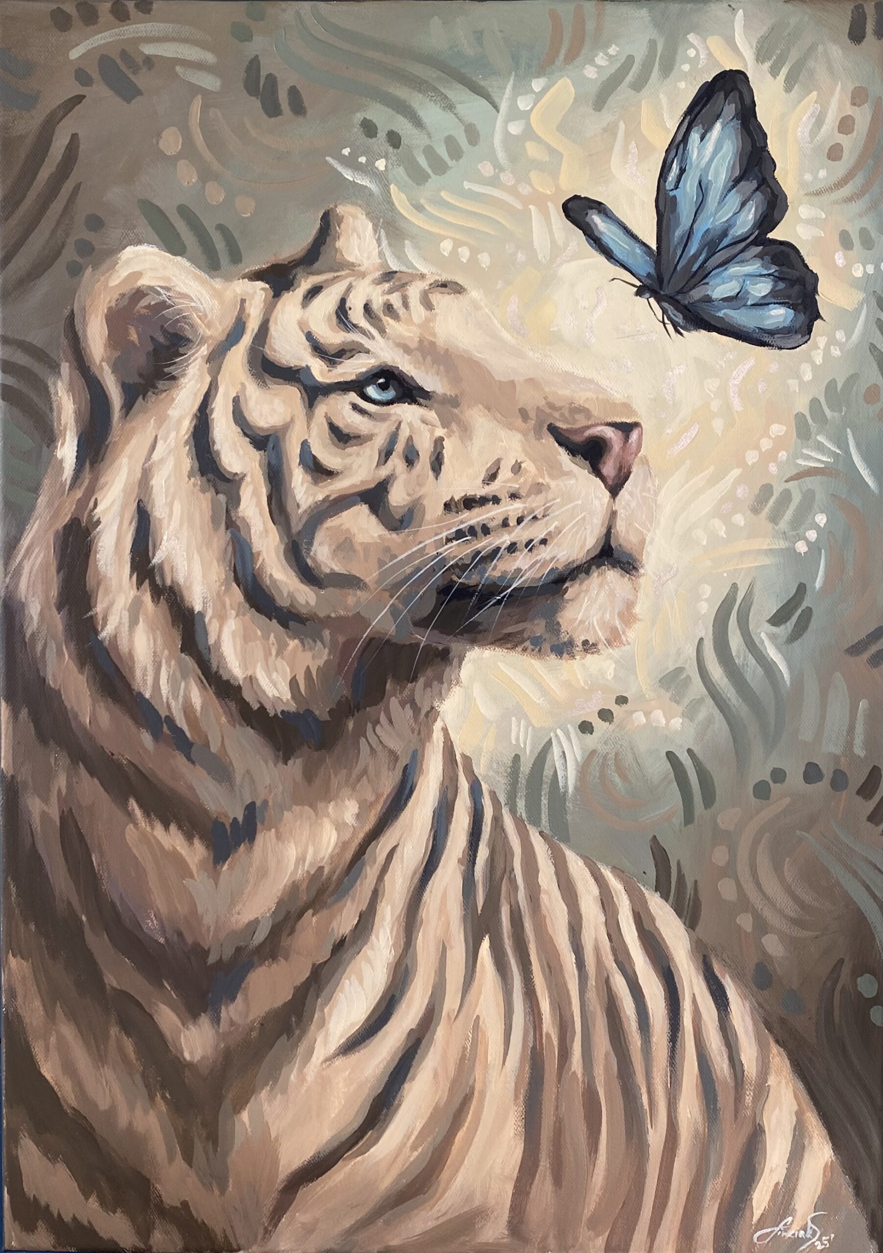 Obraz „Grace in Strength” przedstawia spotkanie dwóch pozornie odległych światów – majestatycznej siły białego tygrysa i delikatności niebieskiego motyla. Tygrys, symbol odwagi i wewnętrznej mocy, podnosi pyszczek w stronę kruchego, ulotnego motyla – znaku nadziei, przemiany i światła.