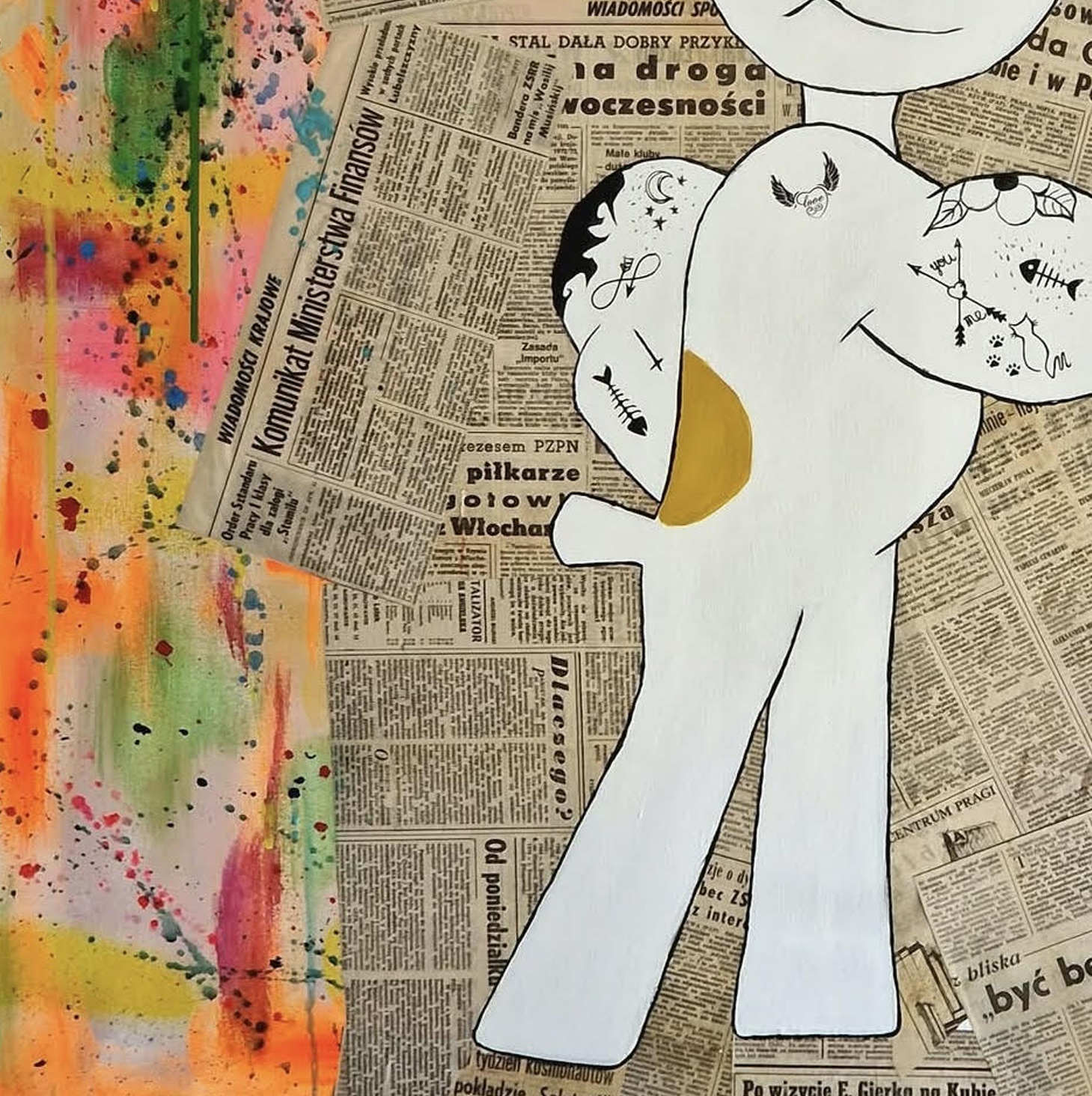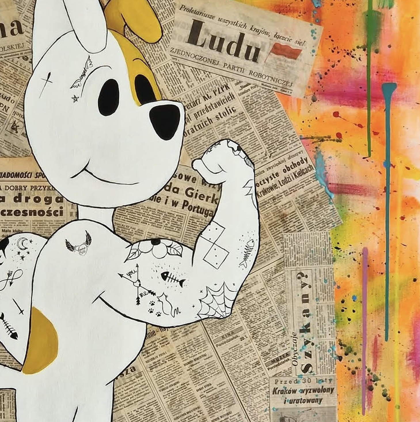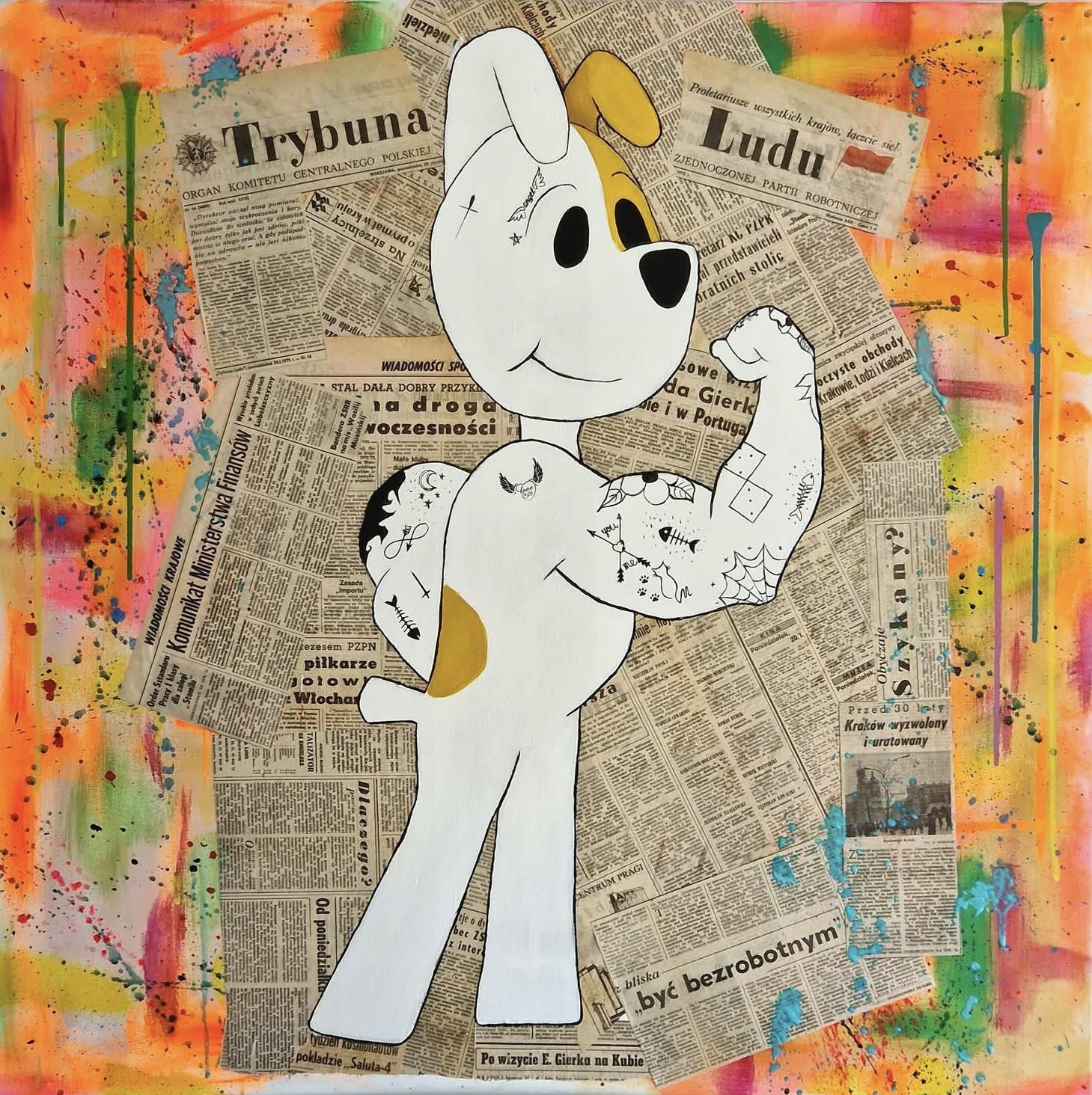 Reksio, 2025, akryl i elementy oryginalnej gazety Trybuna Ludu z 1975 roku, rozmiar: 90×90 cm