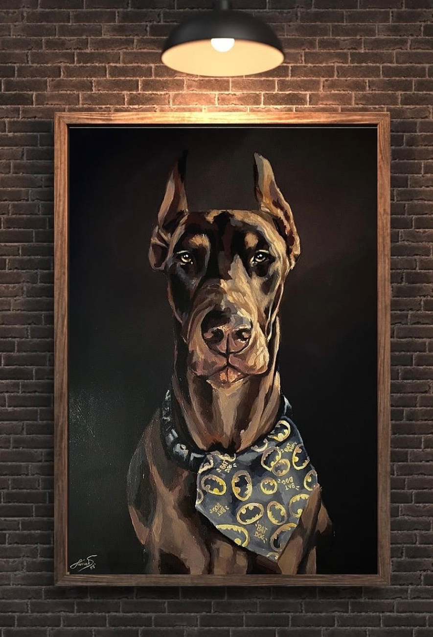 Jak patrzę na ten obraz mam w głowie wizję psiaka którego niestety poznałam tylko na zdjęciach i z opisu. Jednak chciałam przedstawić go jako dostojnego dobermana o silnym spojrzeniu. Ciemne tło nadaje powagi a chusta batmana dodaje indywidualności. Lecz jest coś co chciałam jeszcze w nim uchwycić pięknego. Ciepła, kochająca dusza, której odbicie widać w blasku oka i ciepłym oświetleniu z jego lewej strony. Ten kontrast podkreśla jego obecność